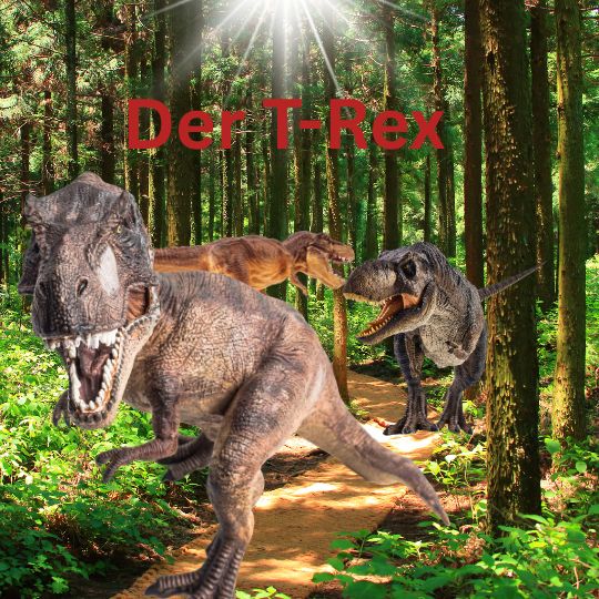 Der Name T-Rex, auch genannt Tyrannosaurus Rex, leitete sich aus dem altgriechischen und lateinischen Wort König oder Despot der Tyrannenechsen. Der Fleischfresser lebte vor etwa 68-66 Millionen Jahren in Nordamerika. Er wurde bis zu 12,3 Meter lang und 4,6 Meter hoch. Er hatte kleine Arme, einen großen Kopf, ein enormes Gebiss und sein Körper war mit Schuppen bedeckt.
